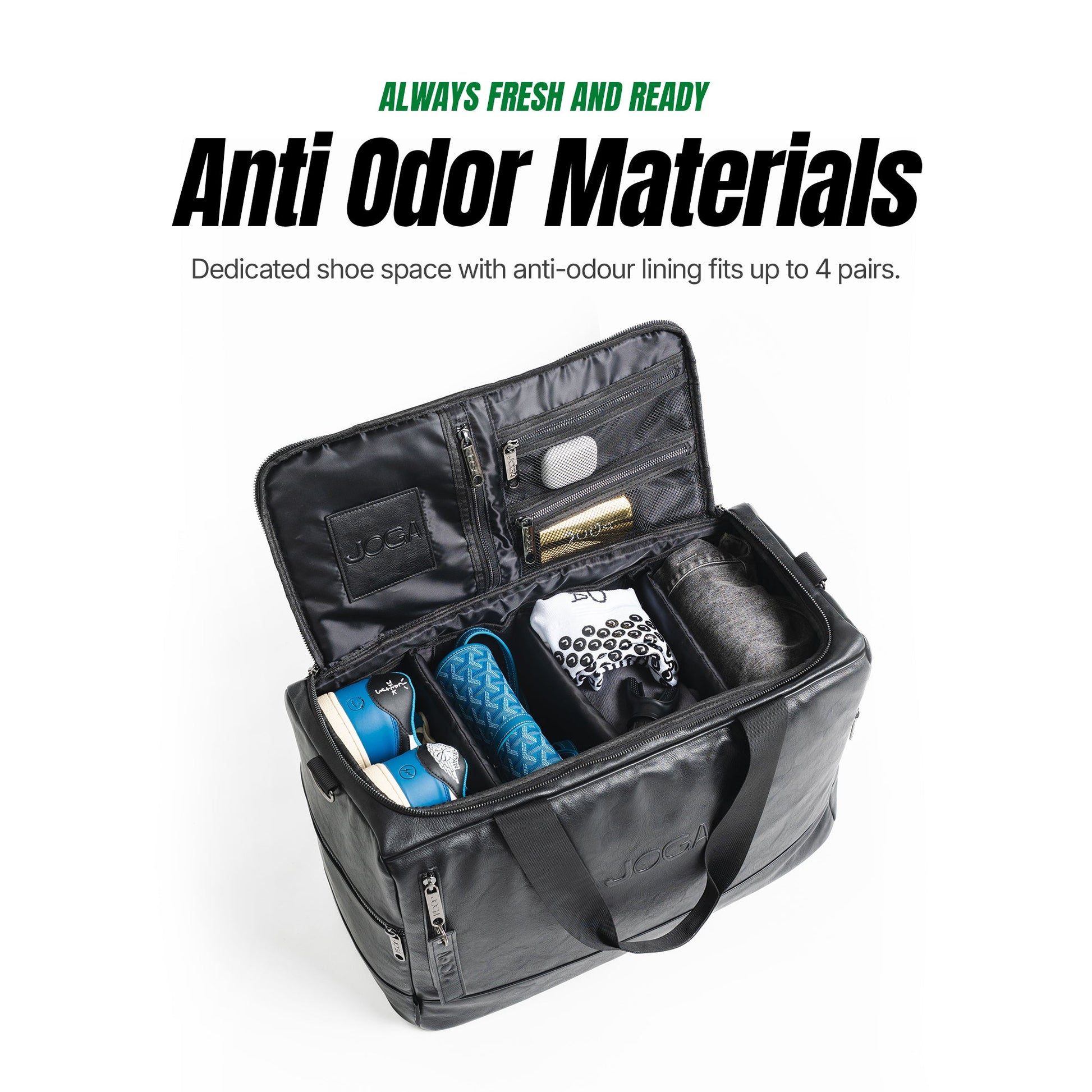 No more digging. Internal dividers, mesh pockets, and a boot compartment keep all your gear sorted.